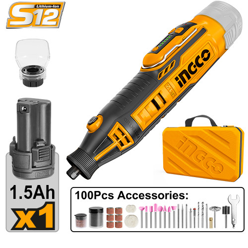 مینی فرز مینیاتوری انگشتی شارژی اینکو مدل CMGLI۱۲۰۱۱ با سرعت گردش آزاد ۸۰۰۰ تا ۳۲۰۰۰ دور در دقیقه همراه با ۱۰۰ عدد لوازم جانبی و جعبه حمل مجهز به نشانگر میزان باتری کولت ۳.۲ میلی متری دارای قفل اسپیندل ولتاژ ۱۲ ولتی سرعت متغیر طراحی ارگونومیک و منحصر به فرد ساخت چین تحت لیسانس آمریکا